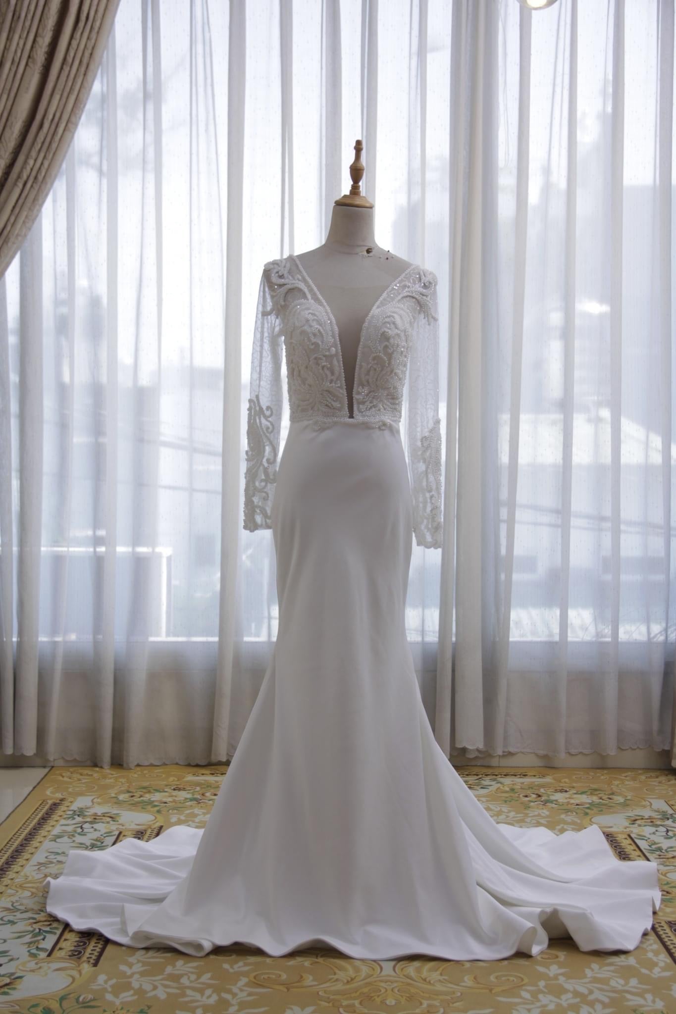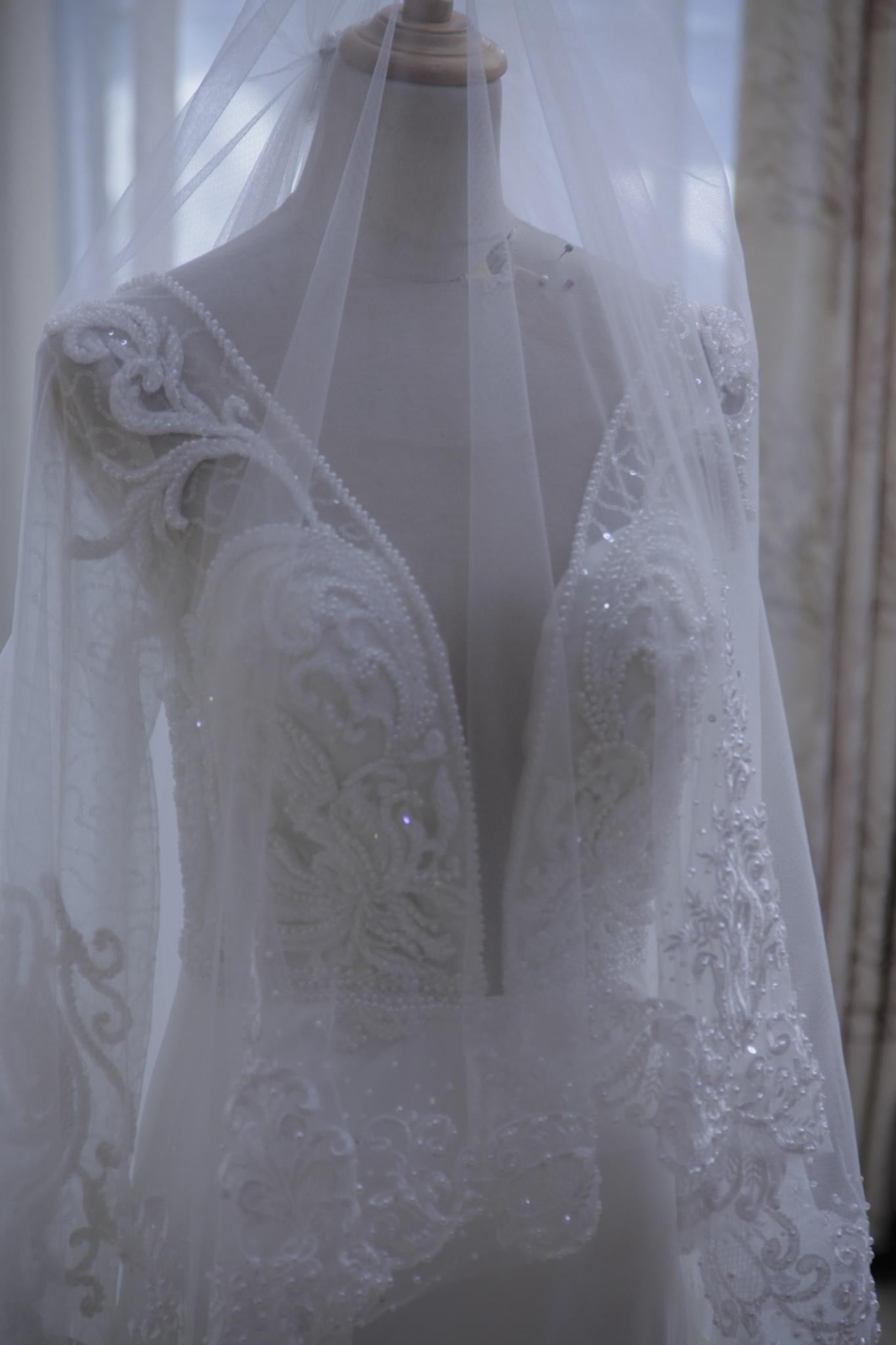- Sheer long sleeves with ornate embroidery and pearls