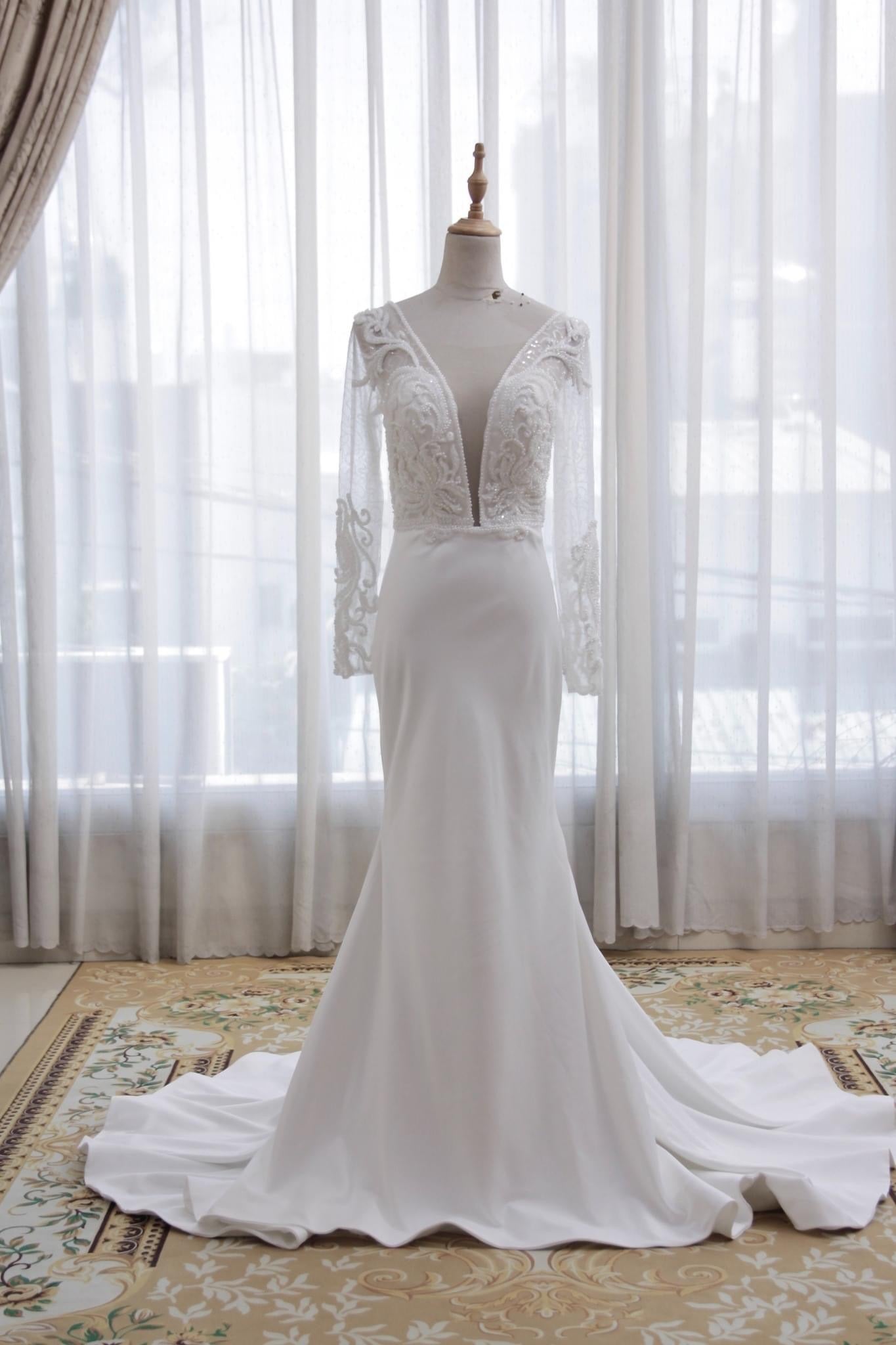 The sheer lace sleeves and back are delicately embroidered with swirling beadwork, offering a romantic yet contemporary bridal look. The fitted skirt gently flares into a graceful train, creating effortless movement and a flawless finish for your aisle moment.