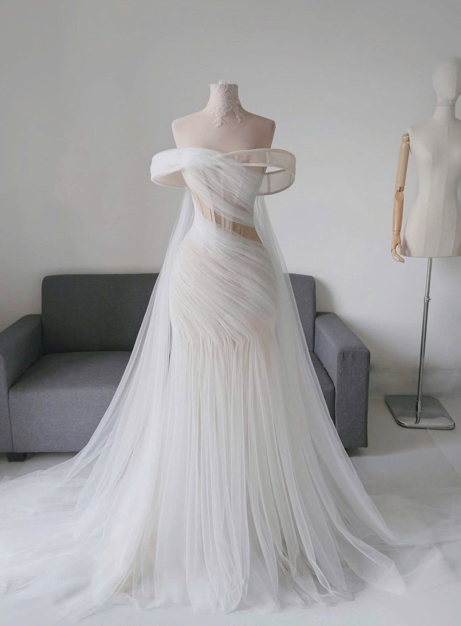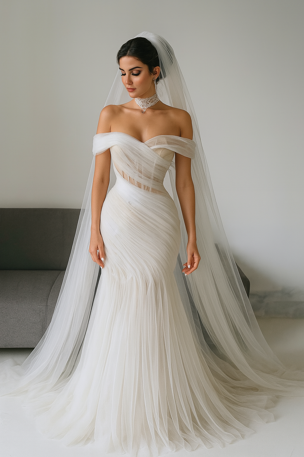 - Off-shoulder tulle wrap bodice with sculpted pleats
