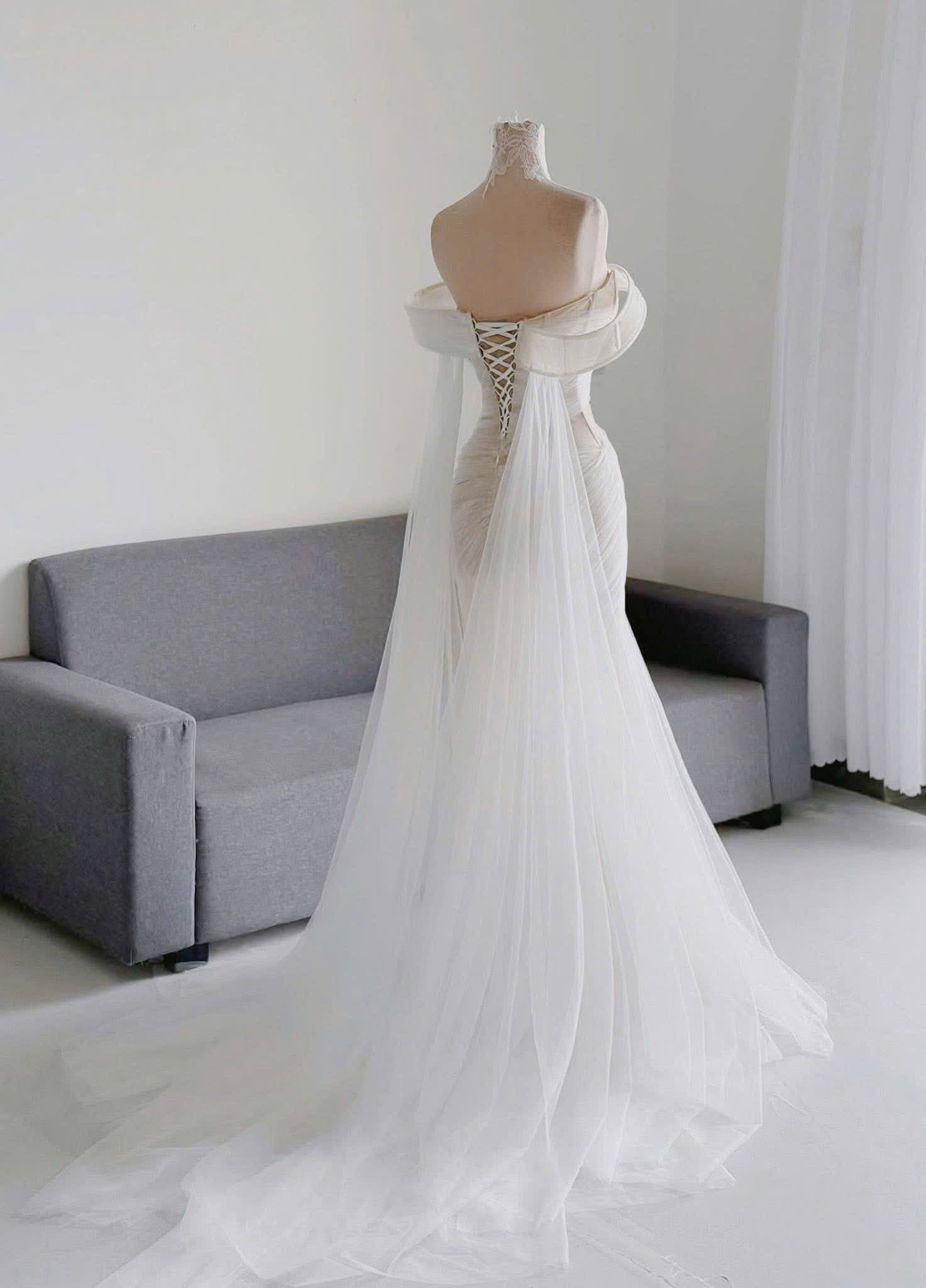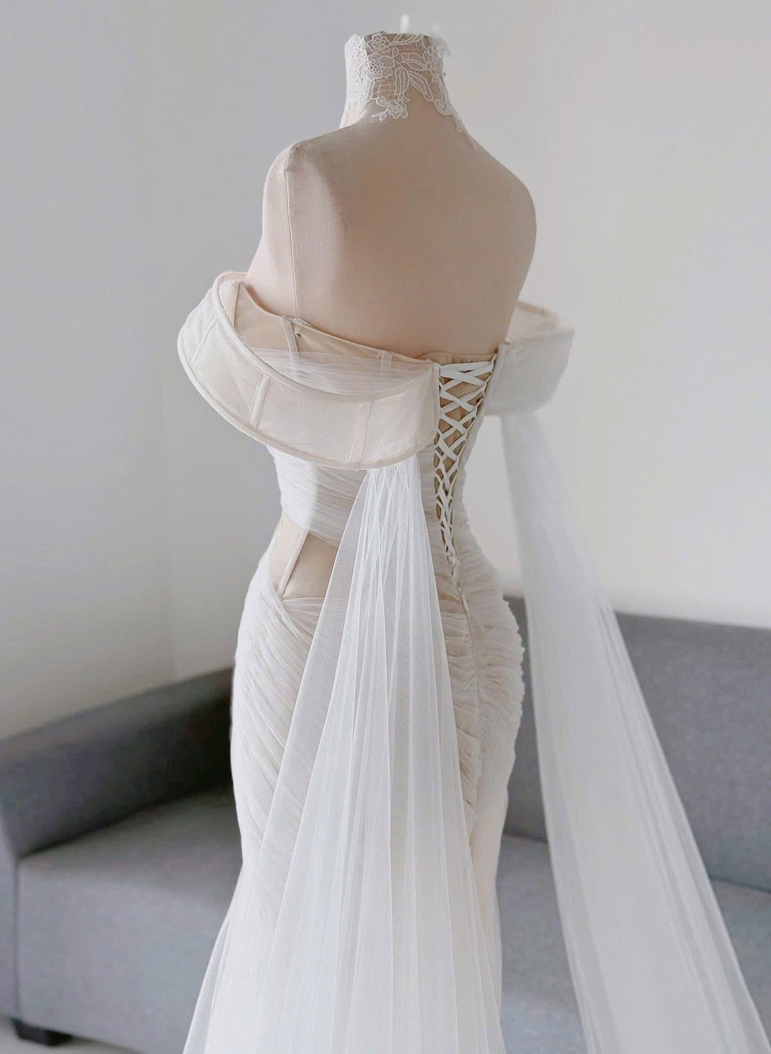 Ethereal, elegant, and designed to captivate — the Daisy Gown is a breathtaking creation for the modern bride who dares to be different. Crafted with delicate layers of soft ivory tulle, this dress features a romantic off-shoulder neckline that wraps around the body in graceful pleats, revealing tasteful cut-outs along the waist for a sculpted, goddess-like silhouette.