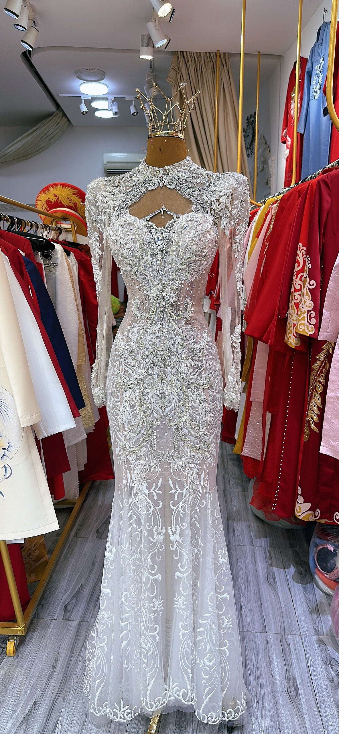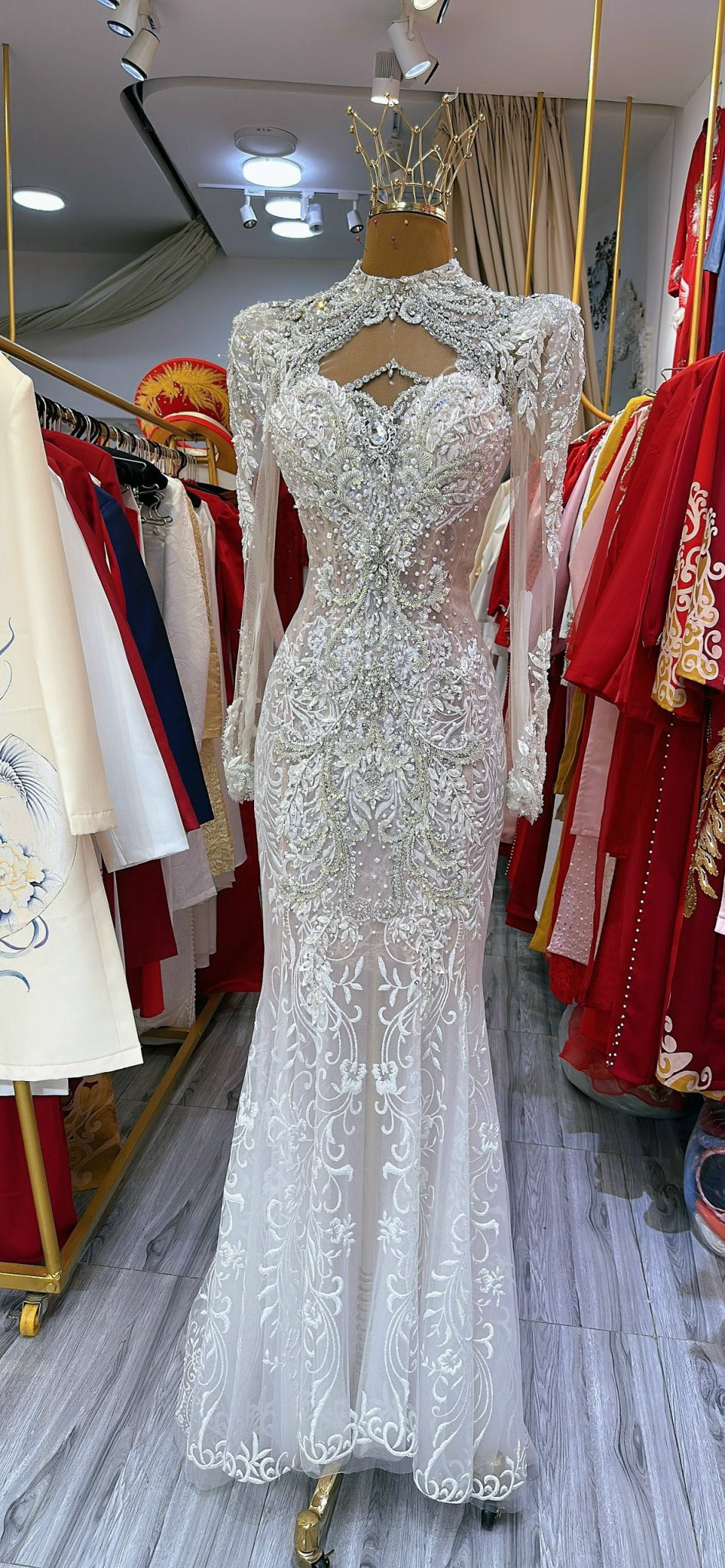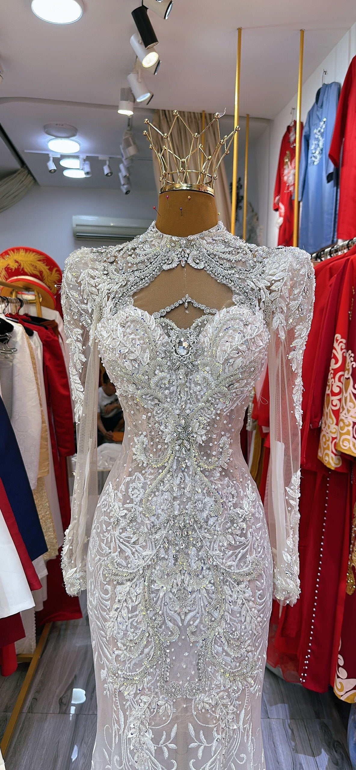 The Leilani Dress is a breathtaking masterpiece of craftsmanship — made for the bride who craves regal glamour with a modern twist. This luxurious fitted gown features a high illusion neckline, long sheer sleeves, and a corseted back, all richly embellished with intricate beading, pearls, and lace appliqués.