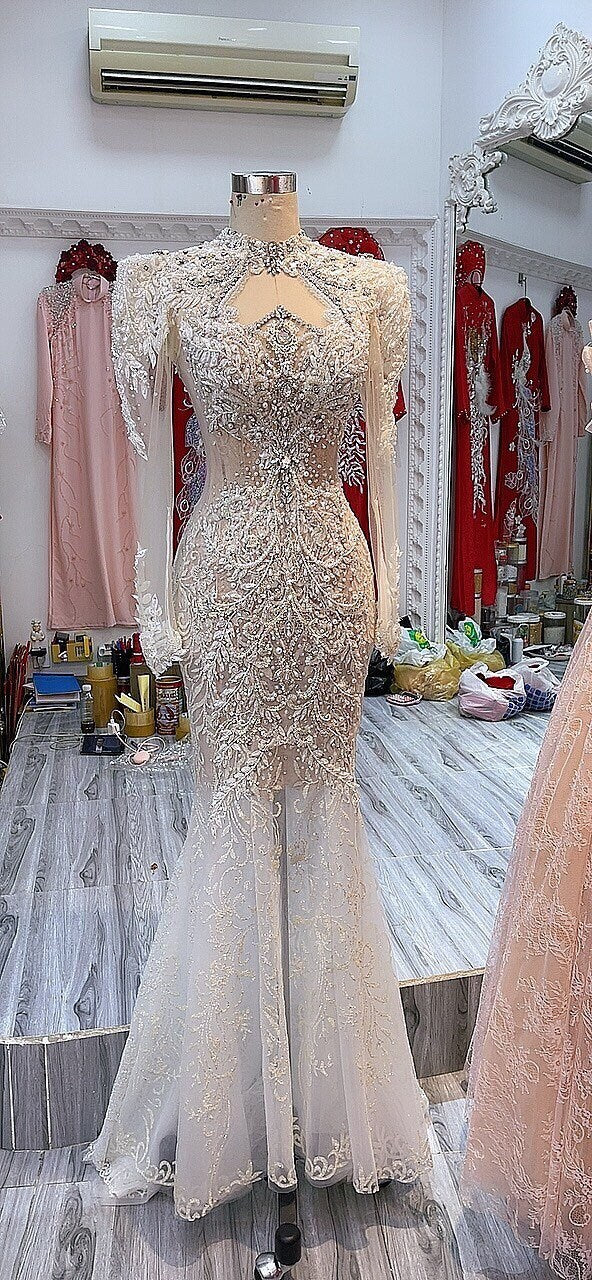 Leilani Dress – Beaded High-Neck Gown with Illusion Bodice & Sleeves