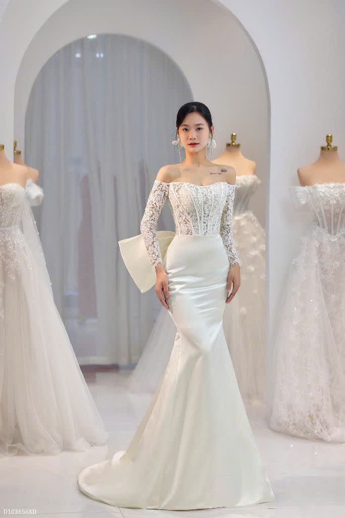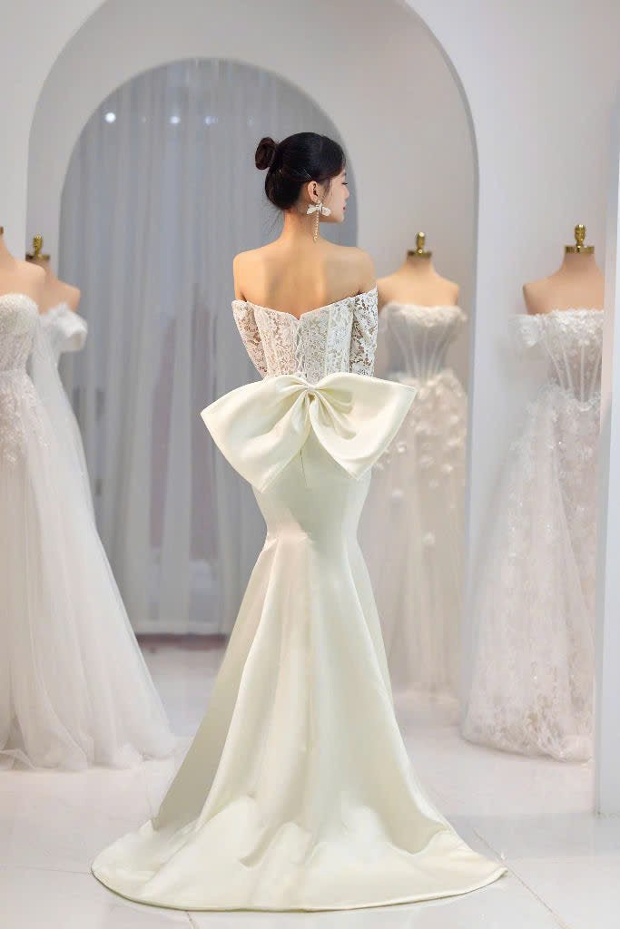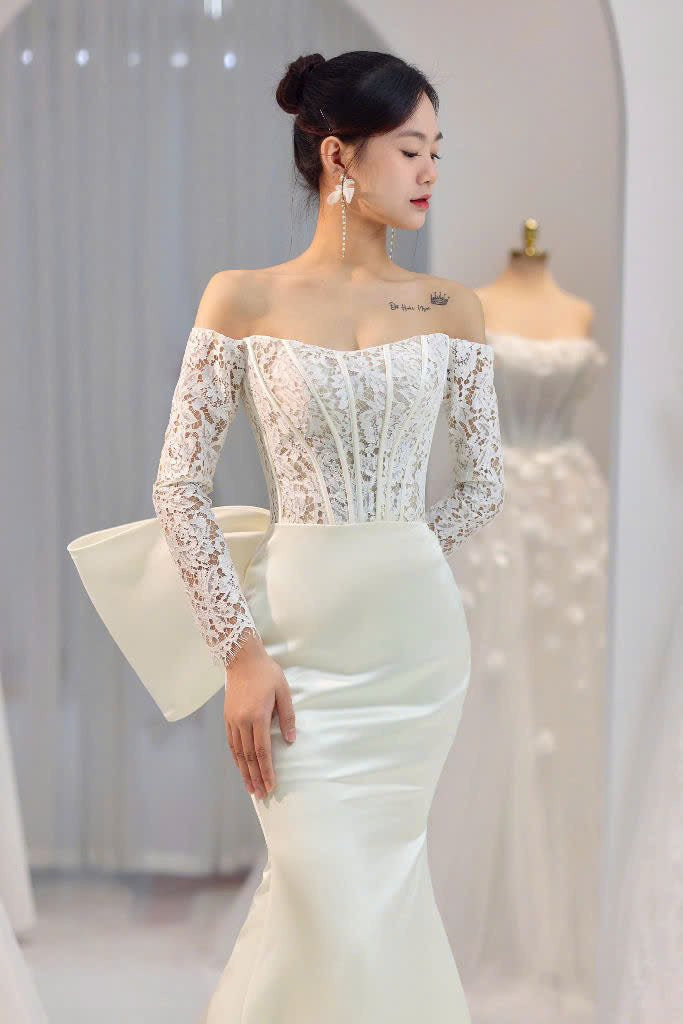 The Madelyn Dress is a breathtaking fusion of timeless romance and modern couture. Crafted for the bride who loves a graceful silhouette with a dash of drama, this off-the-shoulder gown features a sculpted bodice in delicate lace, complete with structured boning for support and shape. Long lace sleeves add a touch of vintage charm, while the sleek satin mermaid skirt flows into a clean, sweeping train.