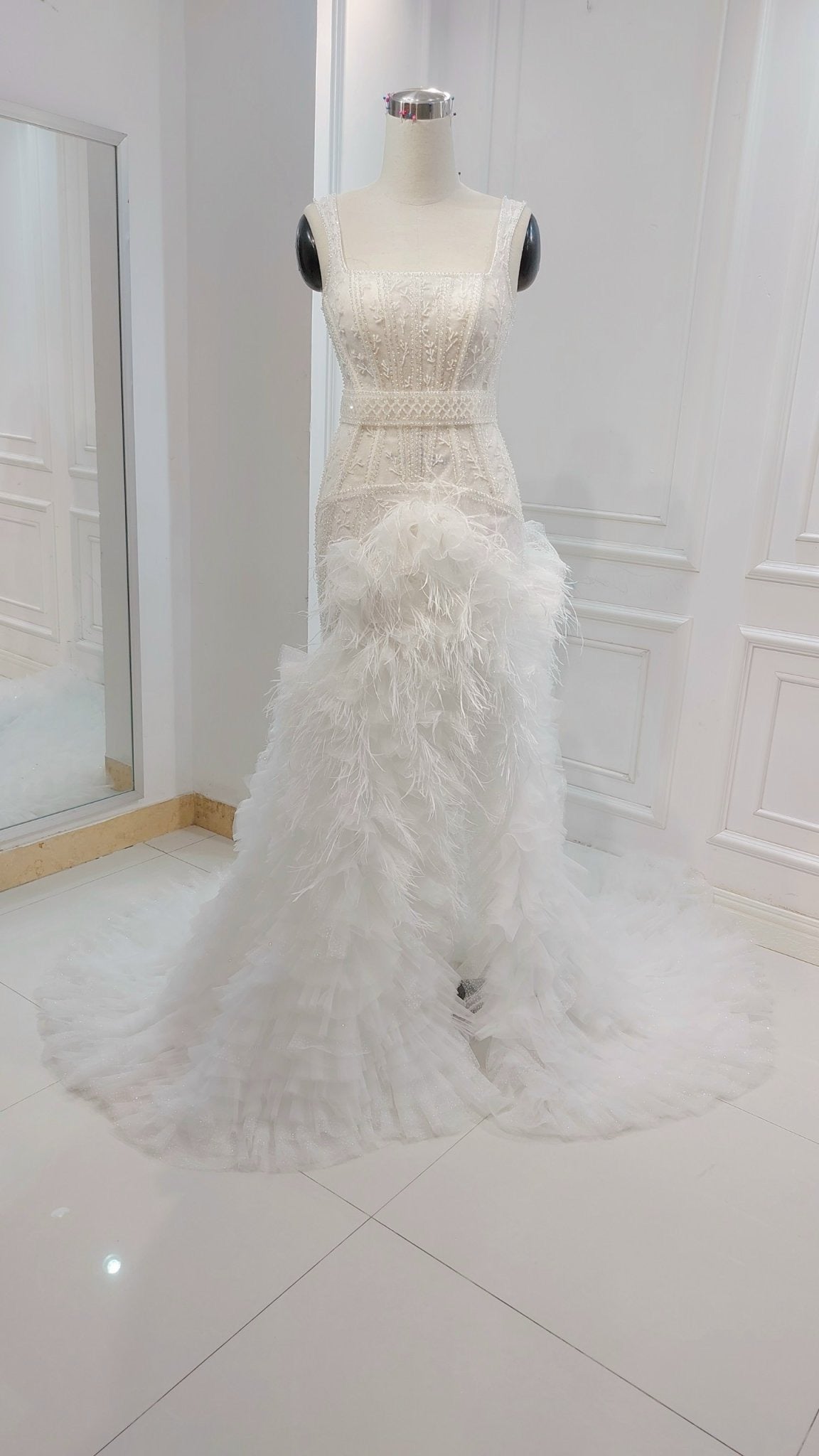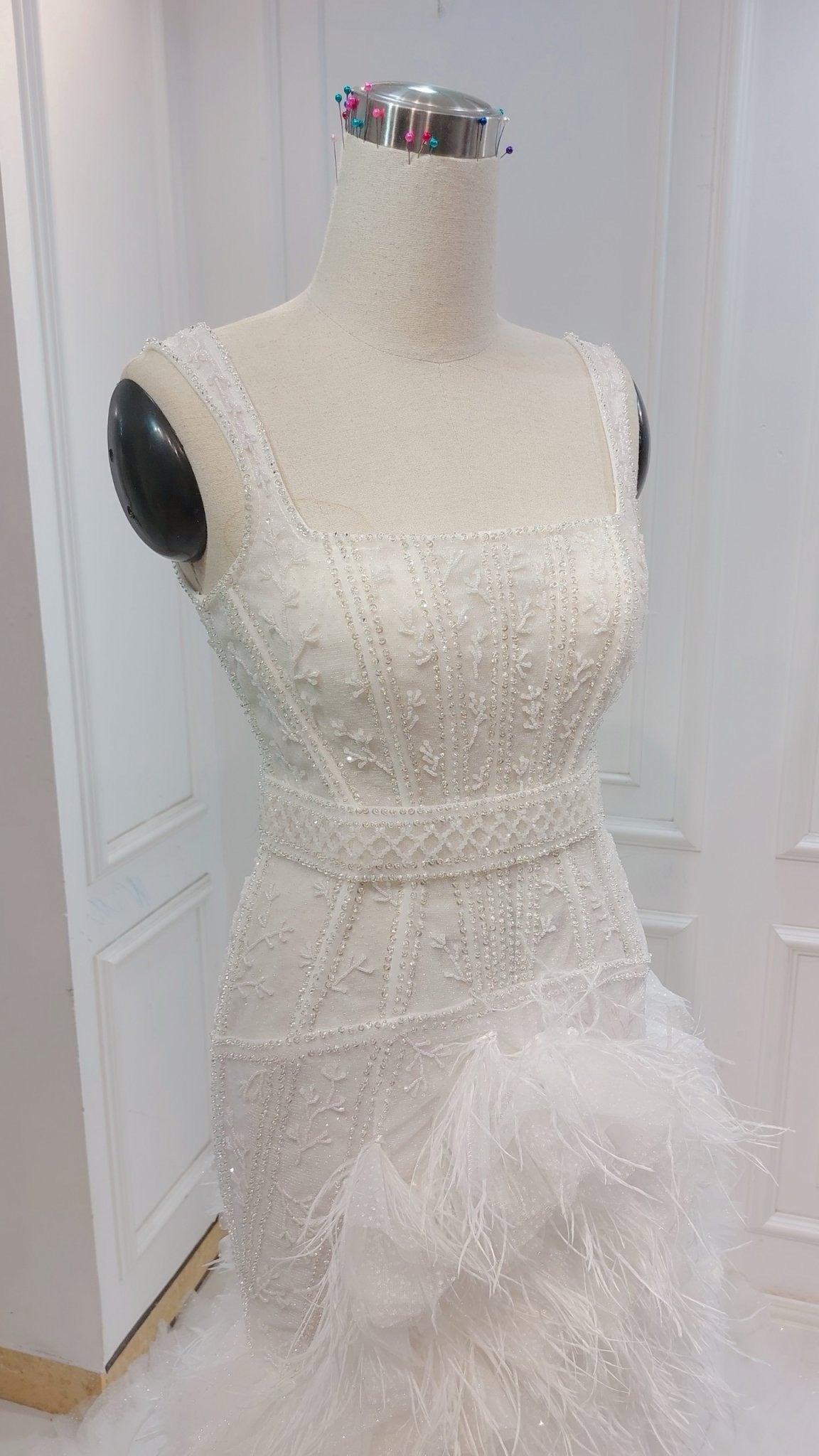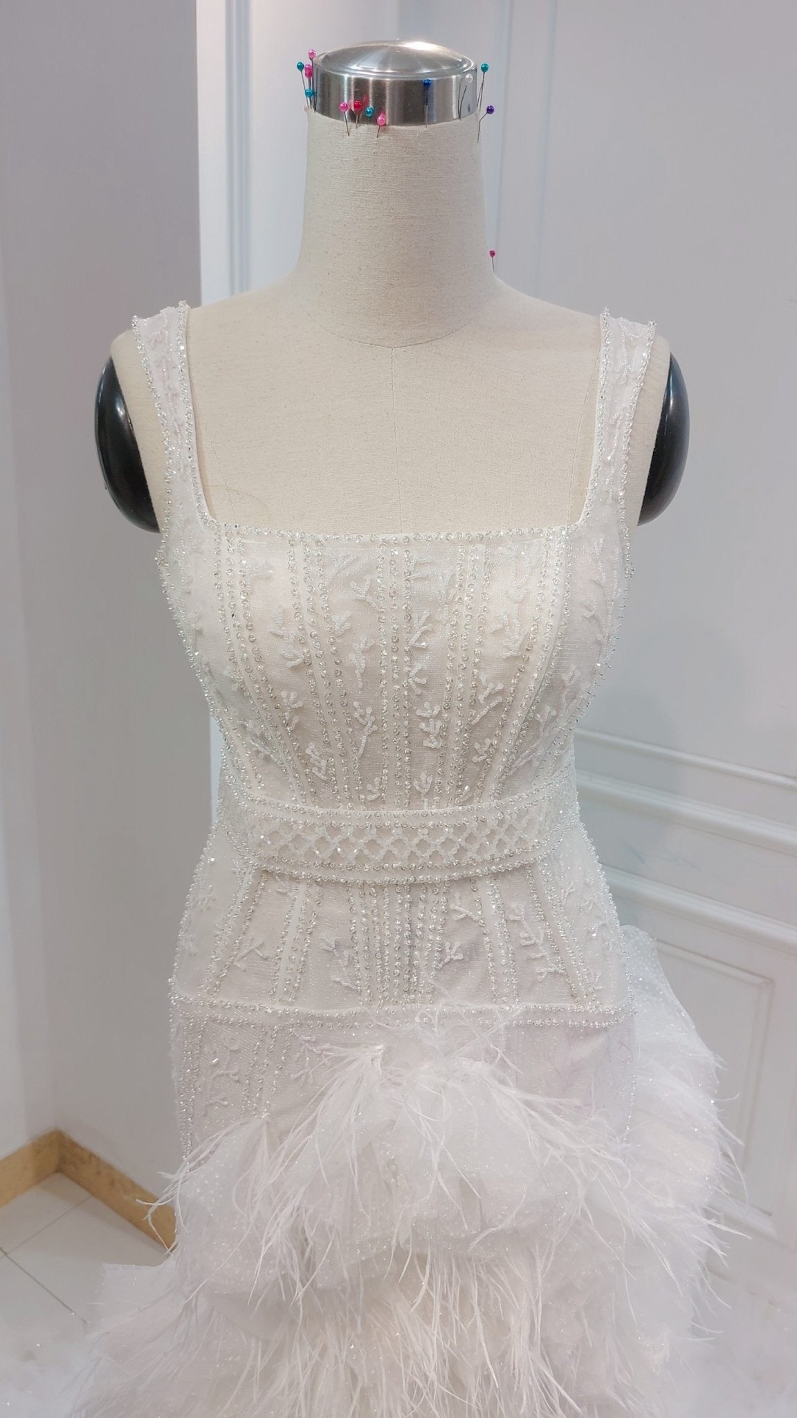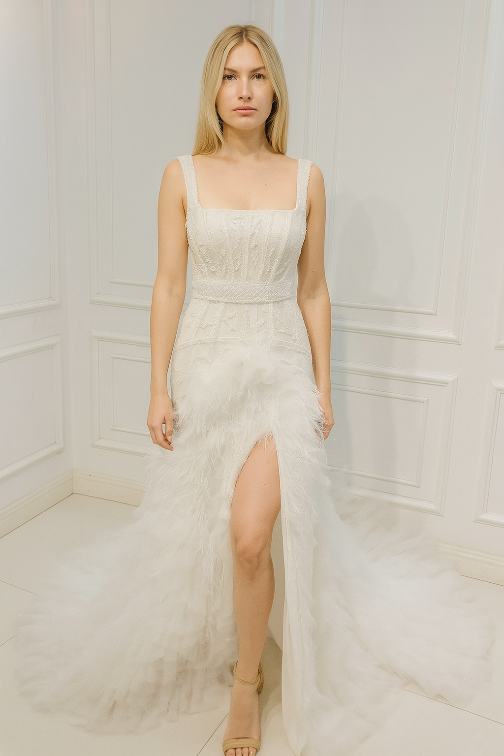 Penelope – Feathered Couture Wedding Gown with Thigh Slit & Beaded Bodice