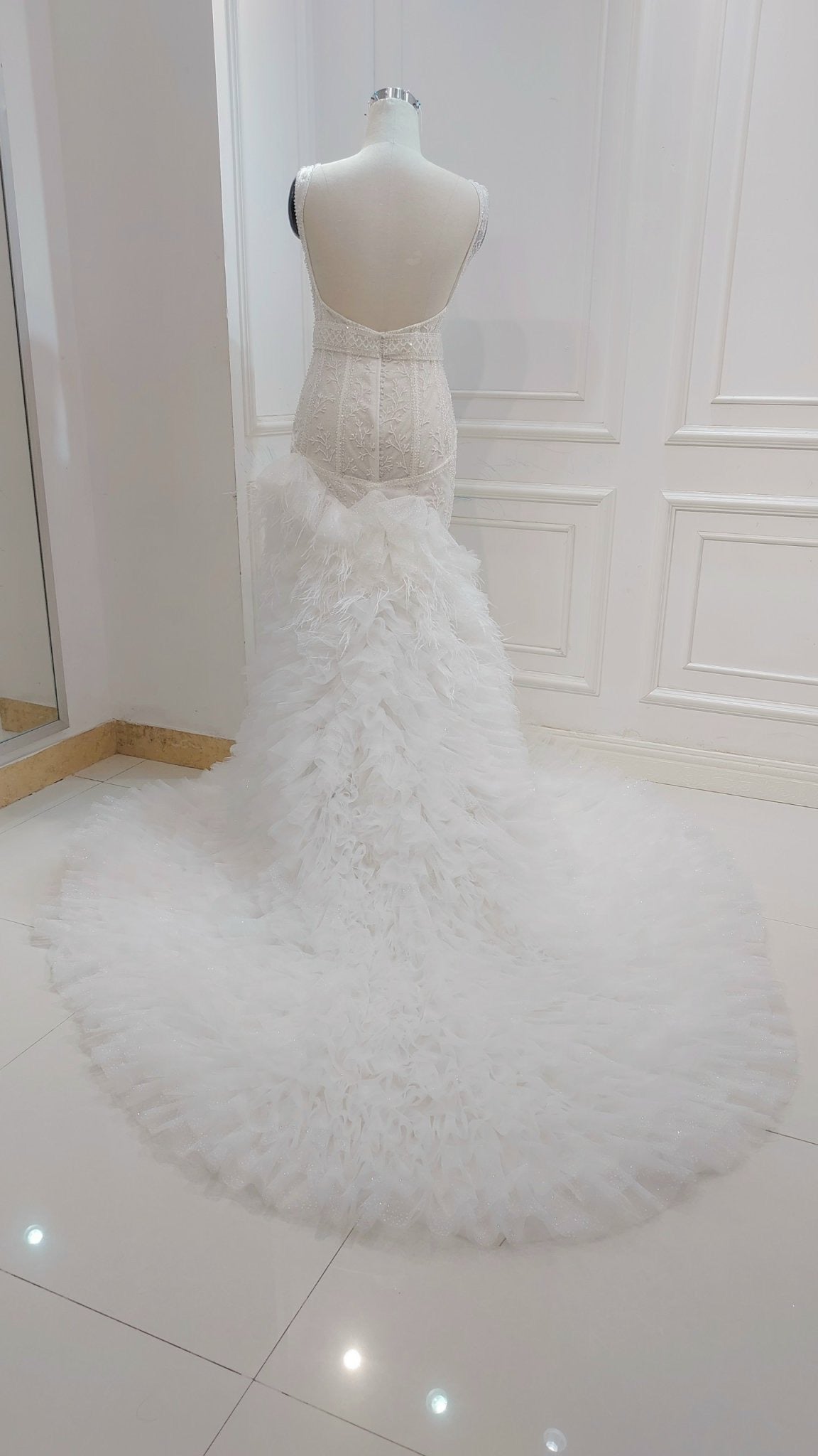 - Feathered and ruffled tulle skirt with a long, sweeping train
