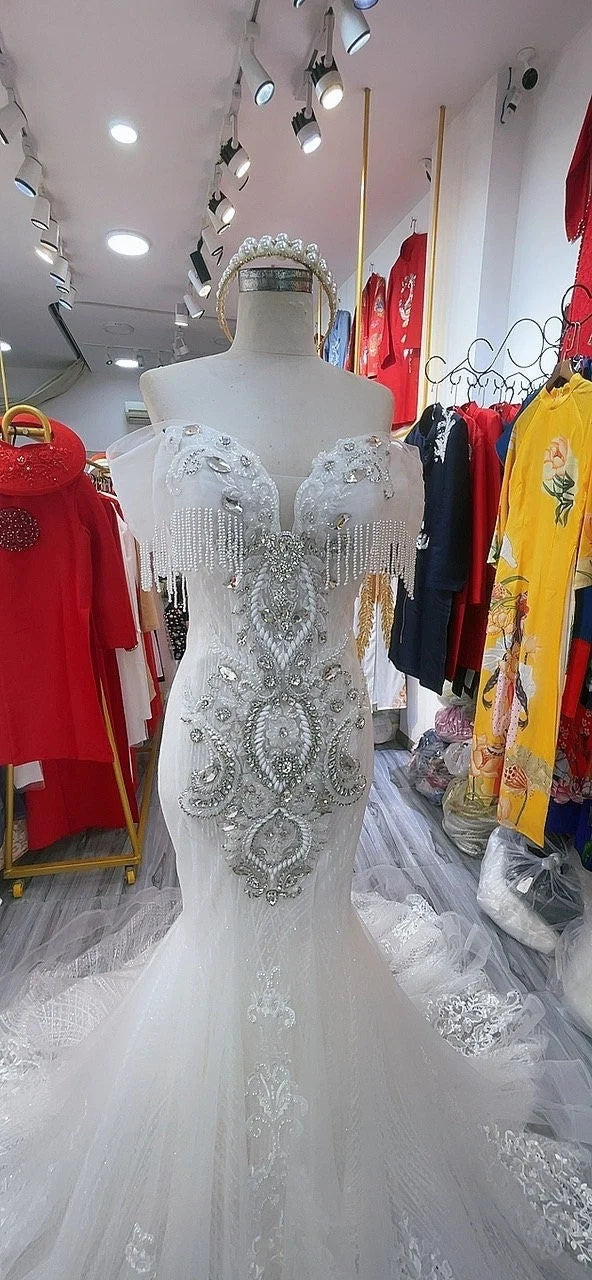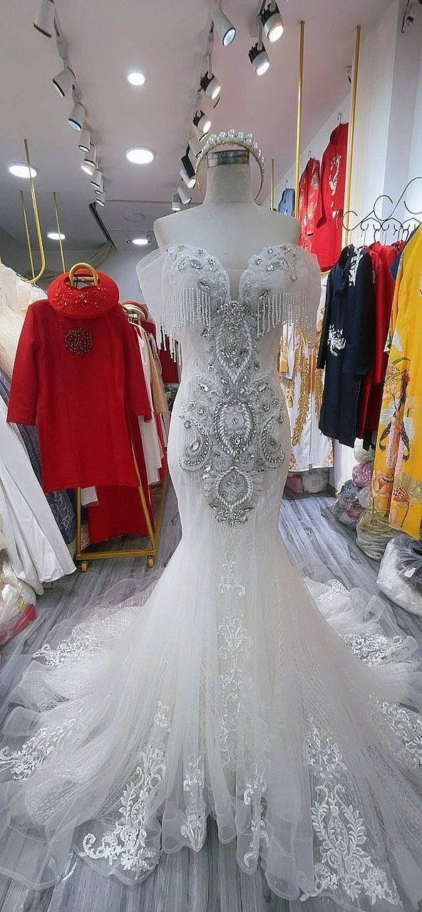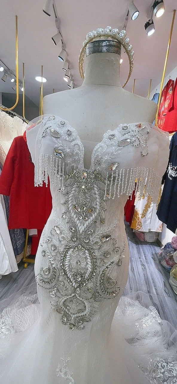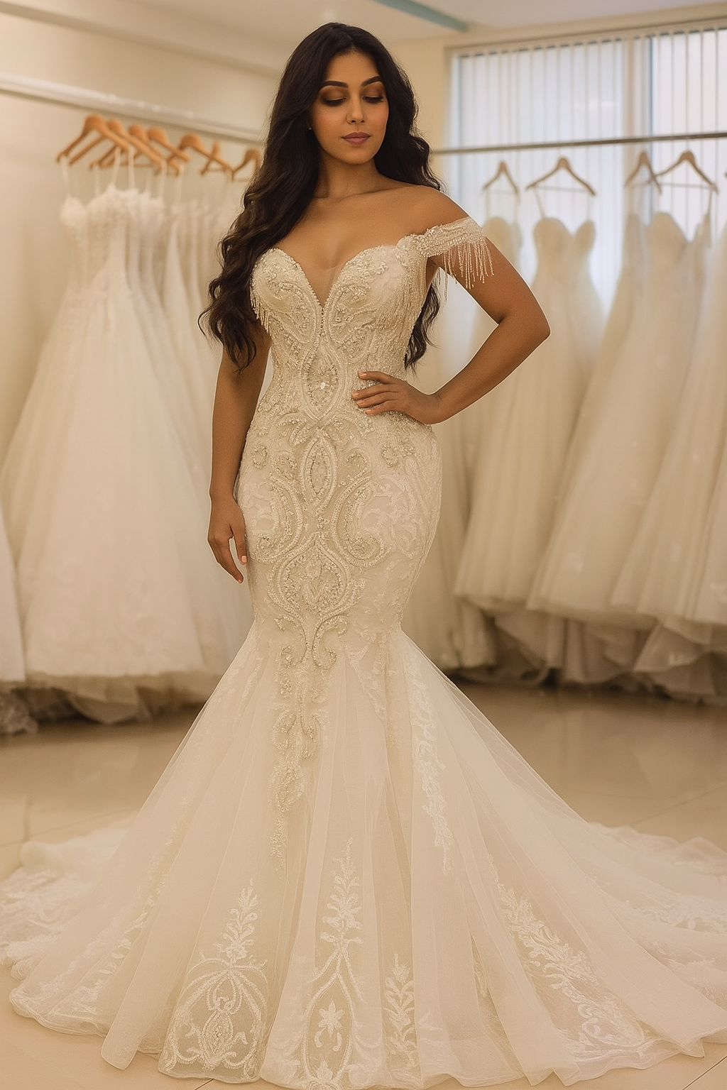 Sophia is a breathtaking mermaid wedding gown that commands attention with its intricate hand-beaded bodice, dazzling sequins, and feminine silhouette. The sweetheart neckline is elevated with sheer off-shoulder tulle sleeves and delicate fringe beading for a touch of vintage glamour.